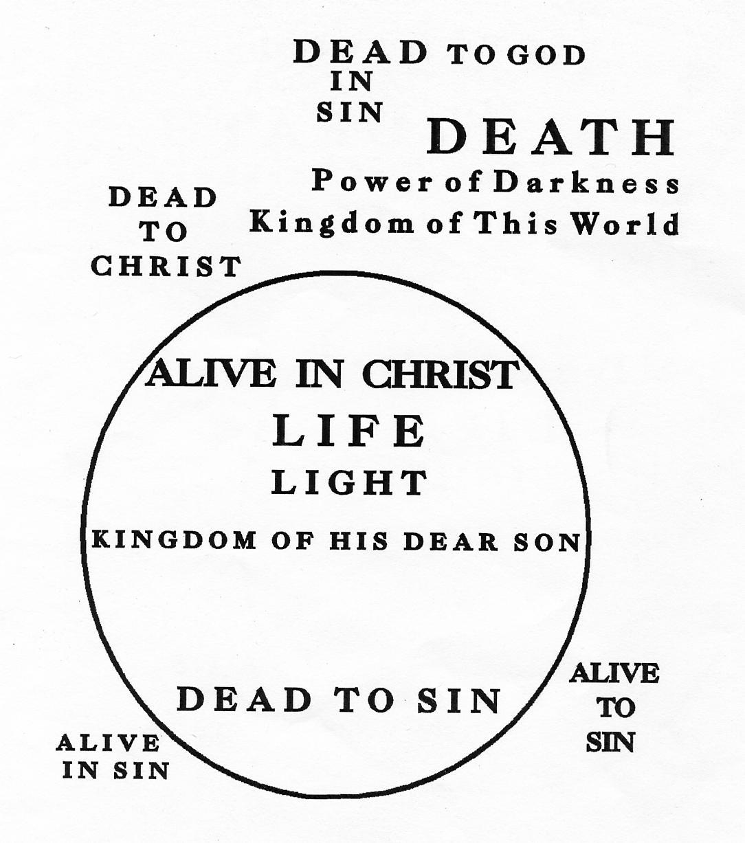 ALIVE or DEAD This chart contrasts the relationships which one who is regenerated has in his or her absolutely new life in The Christ with the relationships which every unregenerated one has and which the regenerated one had before repenting and totally committing continual trust in Him. On the chart above is a circle. Outside the circle at the top are the words “DEAD TO GOD”. Directly underneath the word “DEAD” is the word “IN” and underneath that is the word “SIN.” Every living human being is born in Sin (Ps. 51:5; Rom. 5:12; 1 Kings 8:46; Ezek. 18:4; Jn. 8:44; Gal. 3:22) and are dead in Sin (and sins) and dead to The God (Eph. 2:1-4; 2 Cor. 5:14; Rom. 8:7-13) and bond slaves to Sin and Satan (Jn. 8:34 APT; Rom. 6:17-22 APT) until regenerated by The Holy Spirit (Eph. 2:5; Col. 2:13; Rom. 8:9). Inside the circle at the top are the words “ALIVE IN CHRIST.” Outside and to the left of the circle are the words “DEAD TO CHRIST.” Outside the circle at the lower right hand corner are the words “ALIVE TO SIN.” Now every one outside of Christ is dead to God, dead to Christ, and dead in Sin and at the same time alive to Sin. When one comes in repentance and totally commits trust to the Lord Jesus Christ to embrace Him as Lord and Savior, he or she is placed in the circle of grace or placed ‘in Christ’ by God. And immediately when he or she is regenerated he or she becomes alive to God and alive in Christ. But at the same time God sees him as dead to sin (Rom. 6:2,8,11). Inside the circle at the bottom are the words “DEAD TO SIN”. The Lord Jesus Christ said that the one continually committing trust in Him “is passed from death unto life” (Jn. 5:24). The word “LIFE” is in the center of the circle and the word “DEATH” is at the upper right, outside the circle. The one repenting and completely trusting in The Christ continually passes out of the realm of death into the realm of absolute life in Christ. Paul contrasts light with the power of darkness and states that we are translated into the Kingdom of His Dear Son (Col. 1:12,13). Under the word “DEATH” are the words “POWER OF DARKNESS” and beneath that phrase is “KINGDOM OF THIS WORLD” (Jn. 18:36). Under the word “LIFE,” is the word “LIGHT” and beneath it, is the phrase “KINGDOM OF HIS DEAR SON.” Now, if you have repented of your sins and your sinful way, confessed your guilt as a sinner to God and cried for mercy, and by faith received The Lord Jesus Christ as your Lord and Savior, asking Him to live His life through you and are begotten of The Holy Spirit, you are alive ‘in Christ.’ What God sees, is that you died together with Christ when He was crucified on Calvary on Friday, 14 Nisan (April 2), A.D. 33 (Rom. 6:6; Gal. 2:20; 6:14). Our sins were imputed to Him there and His righteousness is imputed to us when we totally commit continuing trust to Him (2 Cor. 5:21). How do we die to sin? We need to take these four steps according to Romans 6:1-16. First, Recognize what The God sees (Rom. 6:1-10). He sees ‘the old (hu)man of ours’ (that is our past life dominated by our sinful nature subservient to Satan) “crucified together with The Christ so that the body belonging to Sin become ineffective so that we no longer continue serving as a bondslave to Sin” (v. 6). Second, Reckon What God Says (Rom. 6:11). We are to count (reckon) ourselves to be dead indeed unto Sin. Look at the chart above. God not only sees you as dead. He says you are dead if indeed you are in Christ. ‘‘If any man be in Christ, he is a new creature: old things are passed away [the old life is dead]: behold all things are become new” (2 Cor. 5:17). Now here is where you begin to give evidence that you are born again. You must reckon what God says to be a reality in your life. You do this by faith--the same kind of faith you exercised to receive The Lord Jesus Christ and eternal life. If you will learn this lesson now, you will save yourself much heartache and anguish as well as a defeated life. (No one ever explained this to me and it took over twenty years for me to learn the secret of living the kind of life God intended--a life of victory and not defeat.) When you reconcile your bank statement, you find the error in your calculations and bring your check book balance to agree with the total amount that the bank says is your balance. God says you are dead to Sin and alive ‘in Christ.’ Now you must bring your life to agree with that. In order to do this, sometimes I must talk with myself. I have to say, “Fred, you are dead! Old man, lie down there and be dead. Lord, I yield to Thee. Take control in my life.” How else can one reckon self to be dead? Once you reckon what God says, you can take the third step. But do not skip step two! Do not attempt step three with out taking step two first! It will NOT work! Third, Refuse What Sin Seeks (Rom. 6:12). Sin seeks to reign in your mortal body. It wants to retain the control over you that it always had, before you came to Christ. In no way does it want to give up the dominion, control, and reign over you. But you must see that “. . . the Sin is to stop reigning in the mortal body of yours” (Rom. 6:12 APT). Refuse to permit Sin to have its way with you! Fourth, Yield to Christ (Rom. 6:13,16). The secret of victory over the lusts of the flesh is to yield. Learn this lesson well now. This five letter word is the key to success in this absolute life ‘in Christ.’ You cannot follow Christ, unless you deny self, die to self and to sin, and yield to Christ. “You& are aware, are you & not? That to whom you& yield yourselves bondslaves unto obedience, you & are bondslaves to whom you& are continually obeying, either[restrictive, one of two; this first. naturally] to Sin unto death, or to obedience unto righteousness?” (Rom. 6:16 APT). If you really want to live physically and enjoy life ( both physically and spiritually), you must yield in 